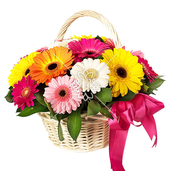 герберы разноцветные – 9 шт., декоративная зелень, оазис, корзина малая, лента.